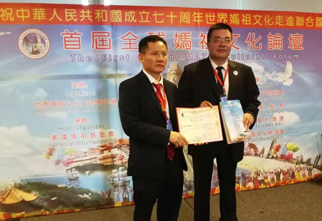 感恩伟大的新时代,同赴大爱新征程。首届全球妈祖文化论坛于2019年9月6日走进联合国总部,我很荣幸应邀参加并作了主旨演讲。海神传说言悠悠,妈祖故乡写春秋。我从事海事工作40多年,一直敬仰并学习践行妈祖文化,并将其应用到海事业务工作中。著有《鼎海圣世》《海昇神韵》,主编的四本海事便民手册也将妈祖精神融入其中,提出并完成了妈祖文化与海事文化融合课题《当代妈祖》。在国内也荣幸参加了历届的“世界妈祖文化论坛”。40多年来积极参加妈祖的各项纪念论坛活动,我清晰地认识到妈祖文化与海事文明的密切关系,也加深了对构建人类命运共同体及妈祖信俗对社会普世价值影响的认识。